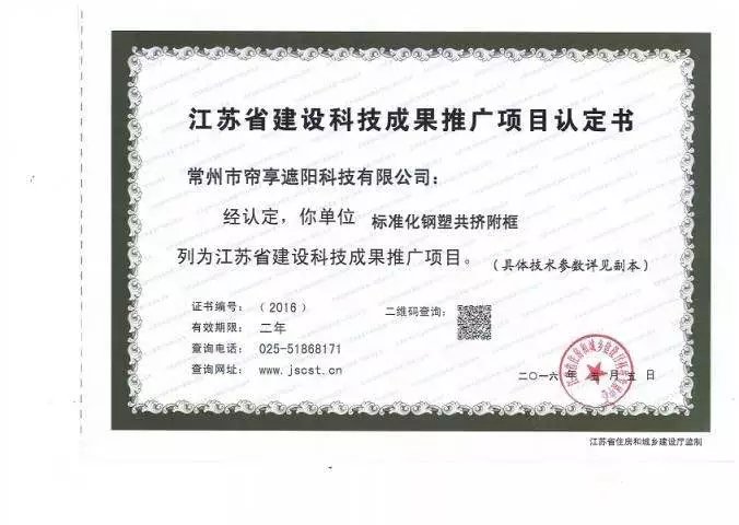 常州市簾享遮陽科技有限公司,坐落于常州市雪堰鎮(zhèn)南宅工業(yè)園區(qū),簾享遮陽企業(yè)專注于外遮陽、外遮陽卷簾窗、建筑外遮陽、卷簾窗、歐式卷簾窗、副框、門窗副框、附框、門窗附框、門窗、門窗五金等系列產(chǎn)品的生產(chǎn)、銷售和服務(wù)。工廠擁有完善的簾片自動(dòng)生產(chǎn)線,八角管自動(dòng)生產(chǎn)線、窗罩成型自動(dòng)生產(chǎn)線和專用的五金配件和塑料制品生產(chǎn)線。簾享所生產(chǎn)的附框?yàn)殇撍芄矓D附框,在江蘇省住建廳的總指導(dǎo)方針下,進(jìn)行了創(chuàng)新,實(shí)現(xiàn)了對(duì)鋼的全包裹覆蓋,融合了鋼附框和木塑附框的優(yōu)點(diǎn),即保證了安全,又實(shí)現(xiàn)了真正意義上的節(jié)能,受到了業(yè)界的一直認(rèn)同與好評(píng)。公司擁有多項(xiàng)鋼塑共擠門窗附框的外型及生產(chǎn)工藝的專利。